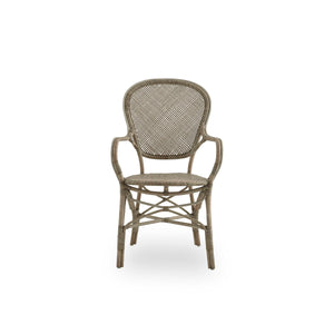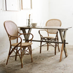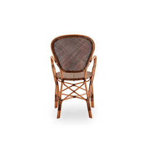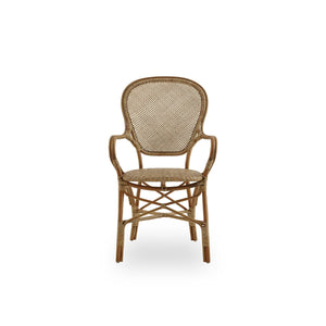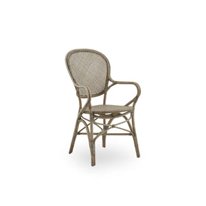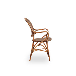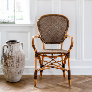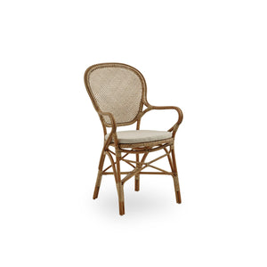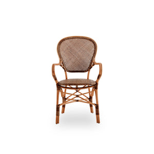 Der Stuhl ist handgefertigt aus Rattan und wird für die Verwendung im Innenbereich und in überdachten Außenbereichen empfohlen. Wenn Rattan Regen ausgesetzt wird, vergraut es und beeinträchtigt die Haltbarkeit.